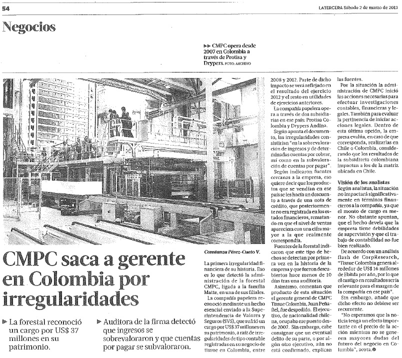 En un hecho esencial enviado el 01 de marzo de 2013 al Superintendente de Valores y Seguros, el Gerente General de Empresas CMPC informa que en la filial colombiana "Tisse Colombia" se detectaron irregularidades contables. Dicha situación se centra en una sobrevaloración de ingresos y de determinadas cuentas por cobrar, así como la subvaloración de cuentas por pagar. Todo lo anterior se produjo durante el ejercicio del año 2008 a 2012. La administración estima que deberá realizar ajustes en su información financiera que implicará una disminución patrimonial cercana a USD37.000.000.-. Producto de lo anterior, la administración del grupo económico informó, tal y como se aprecia en la nota de prensa, la desvinculación del gerente general de la filial colombiana.