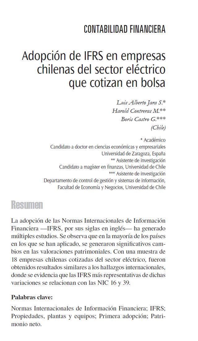 Jara, L., Contreras, H. y Castro B. (2010): "Adopción de IFRS en empresas chilenas del sector eléctrico que cotizan en bolsa". Revista Internacional Legis de Contabilidad y Auditoría. Volumen 42, pp. 131-163.