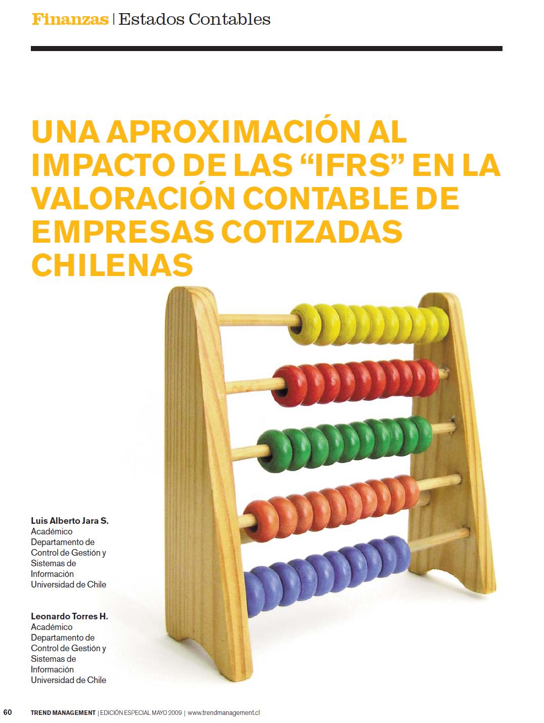 Jara, L., Torres, L. (2009). "Una aproximación al impacto de la "IFRS" en la valoración contable de las empresas cotizadas chilenas". Trend Management, Edición especial Mayo, pp. 60-66.