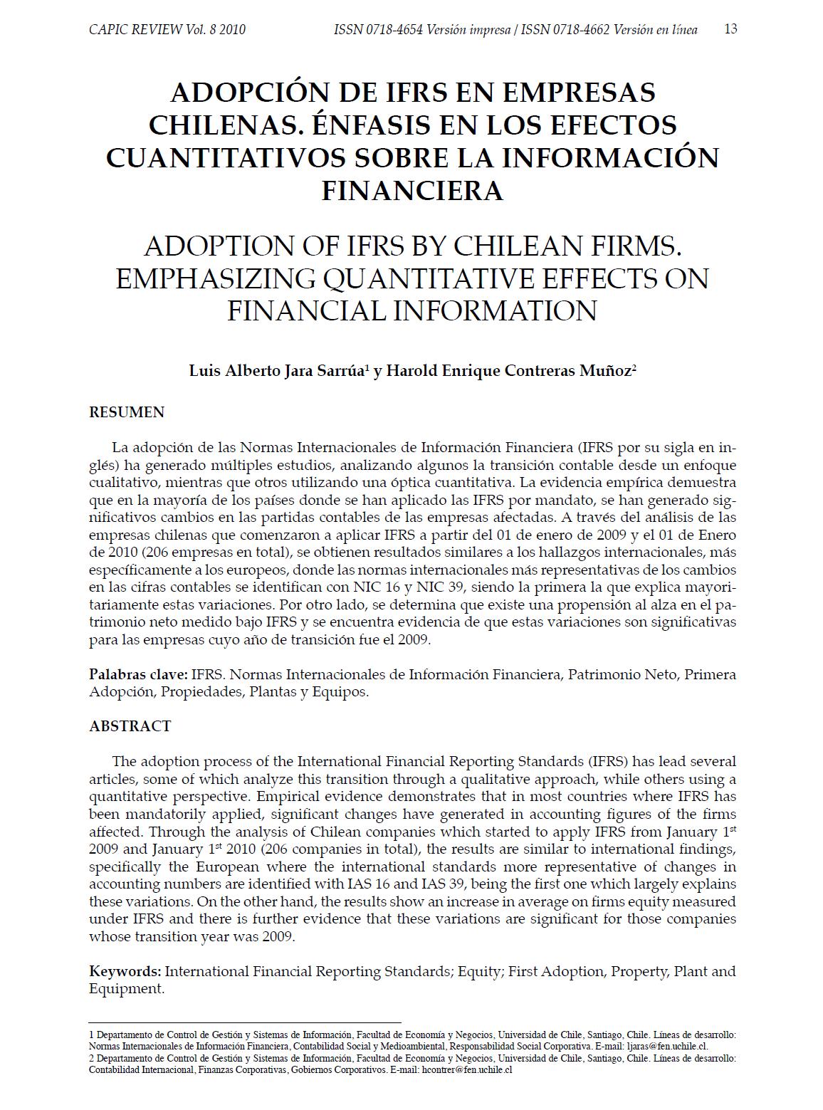 Jara, L., Contreras, H. (2010). "Adopción de IFRS en empresas chilenas. Énfasis en los efectos cuantitativos sobre la información financiera". Capic Review, Volumen 8, pp. 13-24.